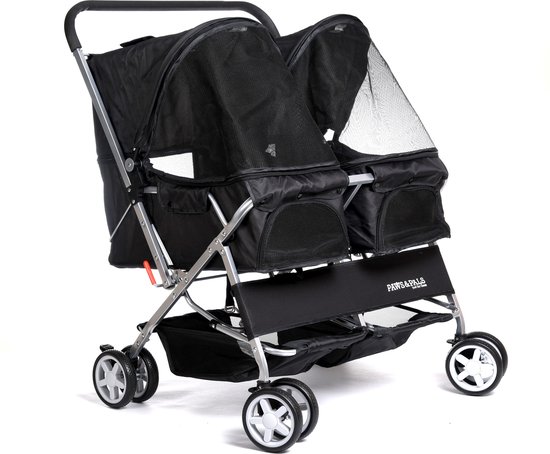 De Paws&Pals dubbele hondenbuggy is een populaire buggy voor mensen die twee kleinere honden willen meenemen. Iedere hond heeft zijn eigen ruimte zodat de dieren elkaar niet in de weg zitten. De kleine wielen maken deze trolley uiterst geschikt voor stedelijke omgevingen en de af te sluiten ruimtes zorgen dat je hond niet zomaar uit de wagen springt.